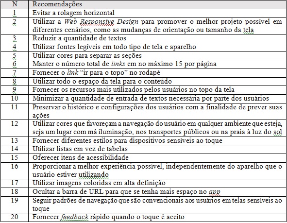 Um exemplo de diferença entre a navegação em um dispositivo móvel e a convencional, adotada em um desktop, refere-se a disposição do conteúdo que, levando em consideração o visor pequeno, não deve ser divido em duas ou três colunas, como acontece normalmente em websites onde a navegação é feita por meio do computador. No Quadro 3, são apresentadas algumas recomendações que podem ser adotadas visando a experiência dos usuários.