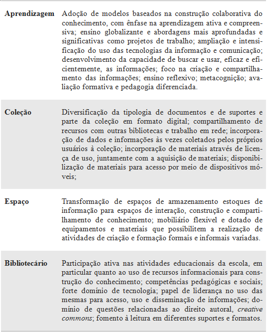 O novo cenário que se apresenta permite a identificação das principais tendências para as bibliotecas escolares para os próximos anos, considerando a aprendizagem, a coleção das bibliotecas, o espaço e o papel do bibliotecário, sintetizados no quadro a seguir.