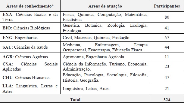 Os participantes da pesquisa foram selecionados entre os integrantes do corpo docente que desenvolve atividades de ensino, pesquisa e extensão em regime de dedicação exclusiva em uma instituição federal de ensino superior localizada no estado de São Paulo. Esses participantes foram agrupados de acordo com oito grandes áreas de conhecimento definidas pela Coordenação de Aperfeiçoamento de Pessoal de Nível Superior (CAPES) e Conselho Nacional de Pesquisa (CNPq): Ciências Exatas e da Terra; Ciências Biológicas; Engenharias; Ciências da Saúde; Ciências Agrárias; Ciências Sociais Aplicadas; Ciências Humanas; Linguística, Letras e Artes.