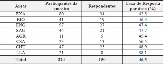 Embora não haja consenso na literatura científica (BARUCH, 1999; SHIH; FAN, 2009) quanto ao índice ideal de respostas de questionários, autores como Weible e Wallace (1998) relatam que para pesquisas por e-mail off-line a taxa de retorno é de 29,8% e de 32,7% com os questionários no formulário online, enquanto que para Sheehan e Hoy (1999) a taxa de respostas é de 24%. Para questionários divulgados via e-mails Cunha, Salluh e França (2010) situam a taxa de retorno na faixa entre 20 a 30%. Conforme mostram os dados da Tabela 2 a taxa de respostas obtidas por área de acordo com os 150 participantes atingiu o índice total de 46,3% compatível com a taxa de retorno acima de 31,25% considerada como aceitável por Wu et al (2004).