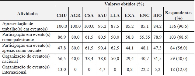 A resposta que alcançou maior percentual (90,6%) em todas as áreas foi apresentação de trabalho em eventos, com 136 respondentes. As atividades de participação de eventos como palestrante foi destaque nas áreas CHU, SAU, AGR e BIO, enquanto que a participação em eventos como ouvintes obteve maiores percentuais nas áreas SAU e AGR.