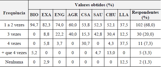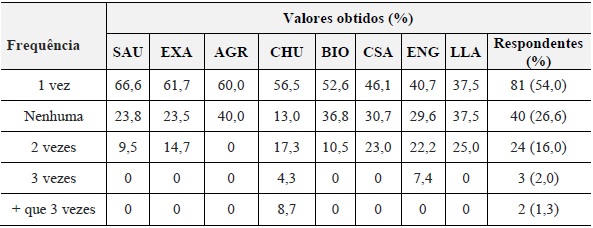 Por sua vez, as respostas sobre a frequência média anual de participação nos eventos científicos nacionais podem ser visualizadas na Tabela 4 que apresenta a frequência média percentual de participação dos respondentes de acordo com as oito áreas do conhecimento.