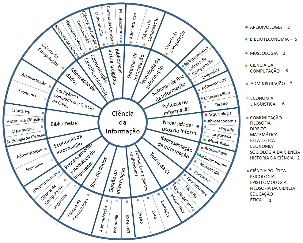 Neste esquema, é possível visualizar 17 subáreas e 48 disciplinas. De um estudo para o outro, revela-se a mudança em relação à permanência, o surgimento e o desaparecimento de algumas áreas e disciplinas mencionadas nos estudos. Algumas disciplinas como a Arquivologia e a Museologia tiveram uma ocorrência menor no segundo estudo. Por outro lado, disciplinas como Administração, Computação, Economia e Linguística tiveram a ocorrência elevada em relação ao primeiro estudo.