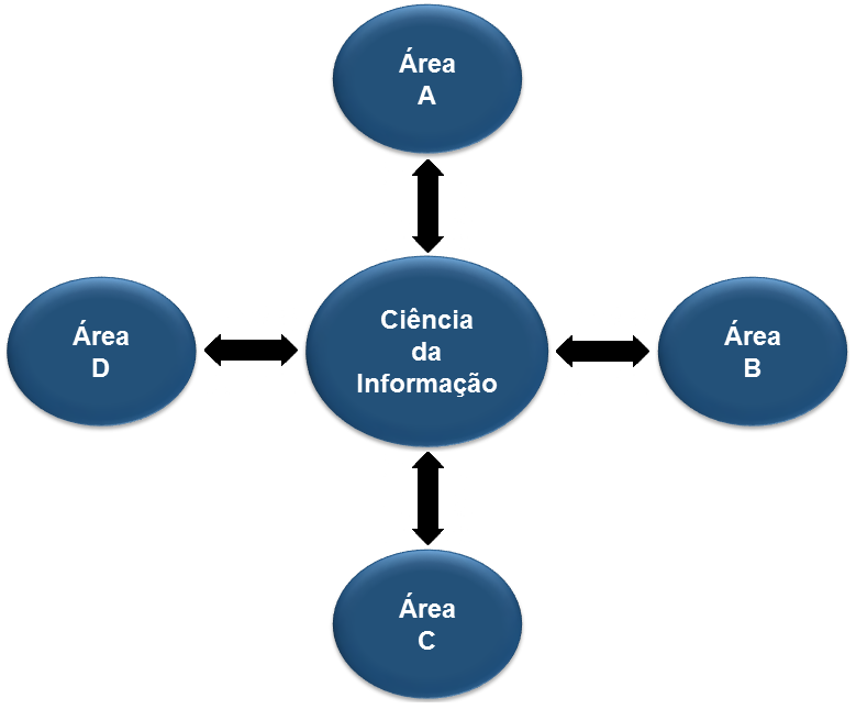 A Figura 1 representa uma efetiva interação interdisciplinar, na qual as setas indicam reciprocidade, demonstrando a troca mútua entre as disciplinas e seus saberes. Os estudos, em sua maioria, visam descobrir quais são as áreas que a CI tem se apropriado, mantendo de fato uma relação interdisciplinar (MORAES; CARELLI, 2016; PINHEIRO, 1998, 2006, 2008; FREIRE; SILVA, 2012; SANTANA, 2012). Seria necessário verificar como a CI tem contribuído para as outras áreas de conhecimento, ou seja, quais são os fundamentos, conceitos, métodos, processos ou produtos originados dessa área, que foram incorporados nas áreas A, B, C ou D (por exemplo), denotando uma real contribuição.