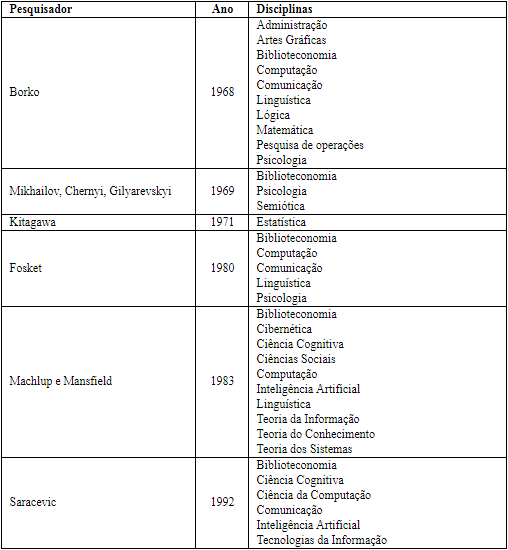 Apresenta-se no Quadro 1, a percepção de diferentes pesquisadores sobre a relação interdisciplinar da CI com outras áreas do conhecimento, a partir de estudo realizado por Pinheiro (2008).