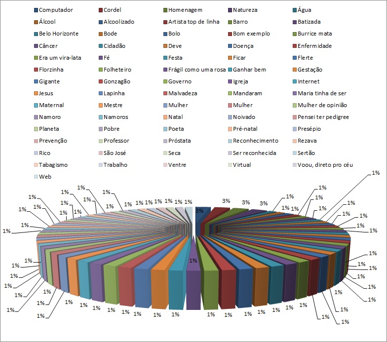 Apesar de perceber certa pulverização ou diversidade poética, percebeu-se que em função desta gama de informação, um amplo nível de interesse se consolida para inspirar a produção poética. Assim, as 71 (setenta e uma) figuras, enquanto elementos concretos retirados do texto em função do processo de representação informacional, permitem fomentar inúmeras perspectivas temáticas. A maior presença figurativa se dá, respectivamente, em torno dos vocábulos: Computador, Cordel, Homenagem e Natureza, onde cada um destes é responsável por 3% de presença entre os textos analisados. Em virtude disso, mostra-se abaixo a frequência temática: