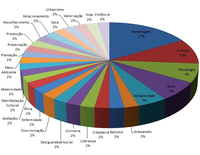 A predominância para os temas de cibercordéis mais citados são, respectivamente: Homenagem (17%), Cultura (10%), Tecnologia (7%), Vício (7%) e Religiosidade (5%). Juntos, são responsáveis por 46% do tal de temas indexados através dos procedimentos de discursivização da semântica discursiva, conforme será detalhada adiante.