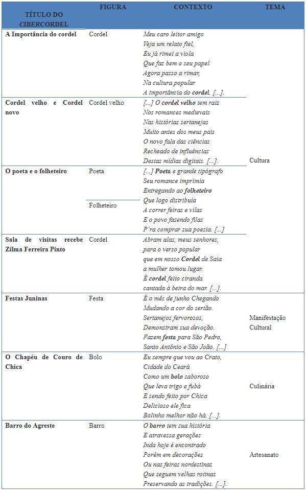 É proposto neste contexto, como objetivo geral, representar tematicamente os cibercordéis dos poetas populares através dos procedimentos semânticos de tematização e figurativização. Visualizando-se atingir esta proposição, traçaram-se os seguintes objetivos específicos: a) mapear os blogs de poetas populares; b) identificar os temas e as figuras dos cibercordéis; c) criar um ambiente virtual (blog) com os temas representados nos cibercordéis com links para os blogs de poetas populares.
