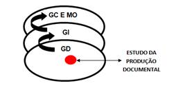 A imagem busca representar como ocorre um processo de complementação entre todos estes sistemas. Não é possível elaborar um programa de GD sem realizar o estudo da produção de documentos; também não é possível trabalhar um sistema de GI se não há um sistema de GD funcionando com eficiência; assim como não é adequado trabalhar a GC sem possuir um sistema de GI que funcione. E, por fim, a função da memória organizacional é subsidiar os processos de GC. Evidencia-se, assim, que o estudo da produção de documentos é essencial para trabalhar com informações e conhecimentos nos ambientes empresariais de maneira consistente.