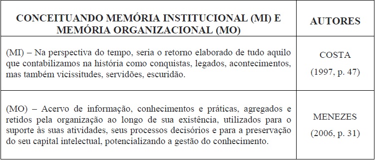 Embora alguns autores trabalhem vários destes elementos como se fossem similares, há uma diferença marcante entre os dois usos da memória utilizados no ambiente empresarial, que se configuram em diferentes conceitos: a memória institucional (MI) e a memória organizacional (MO). Oliveira (2014) organizou em quadro um panorama dos conceitos de memória que diversos autores utilizaram no decorrer dos anos. Neste quadro, em alguns momentos, a definição de uma se confunde com a de outra. Para a finalidade deste artigo, utiliza-se um recorte de duas definições que apresentam de forma evidente as diferenças entre os dois conceitos e sua complementaridade.