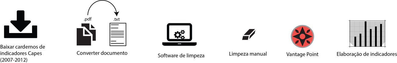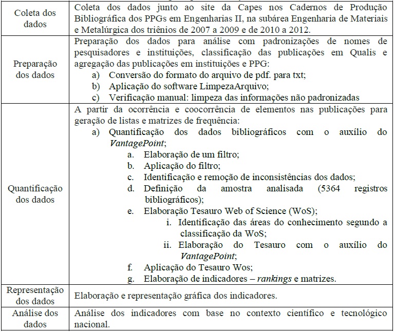 A metodologia utilizada no desenvolvimento desta pesquisa compreendeu uma sistemática necessária à manipulação, controle dos dados, tratamento e análise na forma de indicadores dos dados bibliográficos disponíveis pela Capes por meio dos Cadernos de Indicadores de Produção Bibliográfica em formato PDF, que se consolidam como uma significativa fonte de informações para a elaboração de indicadores de produção científica, pois foi possível nesta pesquisa ter acesso à referência bibliográfica completa dos artigos publicados pelos PPGs da área de Engenharias II, subárea Engenharia de Materiais e Metalúrgica, como por exemplo: nomes dos autores, instituições, título do artigo, nome, ISSN e estrato Qualis do periódico científico, ano de publicação, entre outras