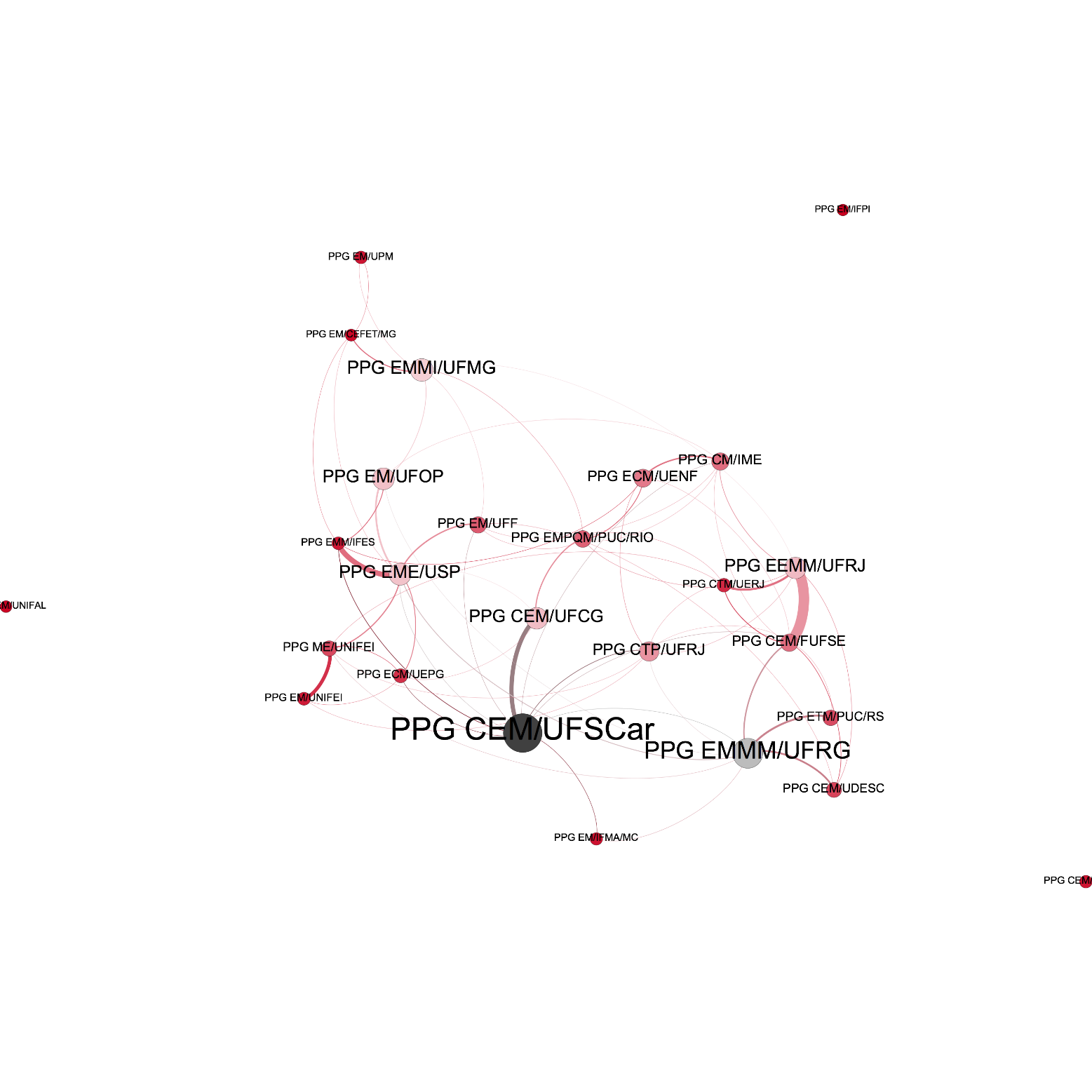 A colaboração científica externalizada na produção de artigos em coautoria entre os docentes dos PPGs pode ser visualizada por meio do indicador bibliométrico de duas dimensões, construído a partir do cruzamento das publicações entre os PPGs, representado na Figura 2, com o auxílio do software Gephi (2016), com base na análise de redes. O tamanho da esfera representa o número total de publicações do PPG, as linhas representam as colaborações entre eles e as espessuras das linhas representam a intensidade das colaborações. Assim, quanto maior for a esfera maior será o número de publicações acumulado e quanto maior for a espessura da linha, ligando uma esfera na outra, maior será o número de publicações em colaboração entre os PPGs. É possível observar que há PPG sem relação com os demais, como é o caso dos PPGs CEM/UNIFAL, PPG EM/IFPI e PPG CEM/UNESC. Esses três PPGs foram criados a partir do segundo triênio da pesquisa (2010-2012) e apresentam nota 3 na avaliação da Capes, o que poderia justificar a ausência de colaboração com os demais programas. Os PPGs que apresentaram as maiores quantidades de publicações foram o PPG CEM/UFSCar e PPG EMMM/UFRG e ambos mantiveram nota 7 nos dois triênios analisados. Já os PPGs que tiveram o maior número de colaborações entre eles foram PPG EEMM/UFRJ e o PPG CEM/FUFSE com nota 6 e 4 respectivamente. Em relação aos PPGs que tiveram maiores quantidades de publicações pode se justificar pelo tempo de criação do PPG e pela infraestrutura disponível. O PPG CEM/UFSCar, por exemplo, é um PPG consolidado na área. Na UFSCar, em 1970, foi criado o primeiro curso de graduação na América Latina de Engenharia de Materiais, em 1978, o curso de mestrado e, em 1986, o de doutorado.