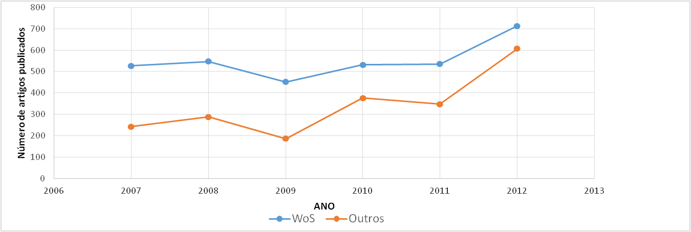 Pode-se observar na Figura 3 a evolução das publicações científicas dos PPGs na subárea Engenharia de Materiais e Metalúrgica, indexadas na WoS e em outras bases de dados. As curvas, tanto das publicações científicas indexadas na WoS quanto em outras bases de dados, apresentam o mesmo comportamento, ou seja, durante o triênio de 2007-2009 sofreram uma queda das publicações científicas e durante o triênio de 2010-2012 houve um aumento considerável. A curva das publicações indexadas na WoS aumentou de aproximadamente 450 publicações em 2009 para 700 publicações em 2012, já a curva de publicações indexadas em outras bases de dados aumentou desde 2009 de aproximadamente 190 publicações para 600 publicações. O aumento da curva de publicações indexadas em outras bases de dados foi muito mais significativo em relação à curva da WoS. Aparentemente, as curvas tendem a se encontrarem nas avaliações futuras da Capes. Uma hipótese para o aumento das publicações indexadas em outras bases de dados é explicada por diversos autores, como Baumgarten (2004) e diz respeito à forma de atuação de algumas áreas do conhecimento, em que suas ações de estudo estão voltadas para questões nacionais e locais, sendo que este fato antes não ocorria com a área das Engenharias. Os pesquisadores, portanto, começam a estabelecer um vínculo entre a pesquisa científica com as necessidades do país, visando fortalecer a produção e a aplicação dos conhecimentos científicos e tecnológicos (MOREIRA; VELHO, 2008).