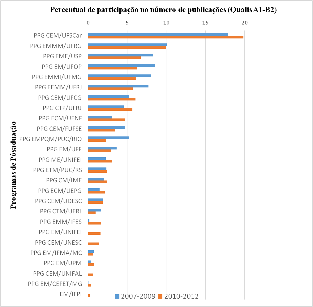 A amostra utilizada para elaborar o indicador de representatividade correspondeu a um total de 4083 registros bibliográficos distribuídos nos estratos Qualis A1, A2, B1 e B2, referentes à produção dos PPGs nos dois triênios 2007-2009 e 2010-2012. A amostra analisada apresentou uma diferença de 221 registros bibliográficos entre o tamanho da amostra analisada e o total apresentado na somatória dos totais de cada um dos PPGs, isso ocorreu devido à colaboração entre os PPGs. Na análise optou-se por utilizar apenas os periódicos classificados no estrato Qualis A1, A2, B1 e B2, pois são periódicos classificados no JCR/ISI e, portanto, recebem o maior peso na atribuição das notas do Sistema de Avaliação da Capes, sendo 100%, 85%, 70% e 50% respectivamente. Os estratos Qualis B3, B4 e B5 não foram considerados, pois esses estratos contêm os periódicos que não foram classificados no JCR/ISI ou não foram indexados na base de dados Scielo e nem publicados por associações. Além de apresentar pouca relevância na avaliação trienal da Capes por apresentar pesos 20%, 10% e 5% para as publicações científicas nos estratos B3, B4 e B5, respectivamente. Alguns PPGs que aumentaram a sua representatividade no total de publicações no período de 2010-2012 foram: PPG CEM/UFSCar, PPG CEM/UFCG, PPG CTP/UFRJ, PPG ECM/UENF, entre outros. O PPG CEM/UFSCar no primeiro e no segundo triênio de avaliação recebeu nota 7, o PPG CEM/UFCG recebeu nota 4 na avaliação do primeiro triênio e nota 5 na avaliação do segundo, o PPG CTP/UFRJ recebeu nota 6 na avaliação do primeiro triênio e nota 7 na avaliação do segundo e, por fim, o PPG ECM/UENF no primeiro e no segundo triênio de avaliação recebeu nota 4. Observa-se, portanto, que o aumento na concentração de publicações de um determinado PPG aumentou ou manteve a nota de avaliação da Capes. Os PPGs podem despender esforços em publicações no sentido de melhorar o resultado de sua avaliação, ao priorizar a publicação em periódicos classificados no JCR/ISI, que recebem um peso maior no momento da avaliação.