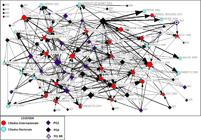 d) análise de relações: buscou-se aqui apresentar as relações entre os citantes, os citados e os temas, por meio do software UCINET/NetDraw[6]. Para isso, a técnica de ARS foi utilizada, visando expressar os vínculos, os pesos e atributos inerentes às relações. Nessa etapa, optou-se por converter o rótulo com os nomes dos PQ-CNPq em códigos. Isso ajudou a preservar a identidade dos atores, chamando a atenção para os comportamentos do grupo analisado, eximindo-se de questões pessoais e análises individualizadas que fugissem do foco da pesquisa.