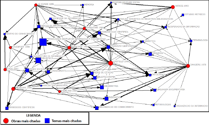 Dentre as dez obras mais citadas, os vínculos caracterizados como mais estreitos com determinados temas foram: Dahlberg (1978) / Ontologias (oito relacionamentos), Dahlberg (1978) / Organização do Conhecimento (sete relacionamentos), Meadows (1999) / Comunicação Científica (sete relacionamentos), Meadows (1999) / Produção Científica (sete relacionamentos), Castells (1999) / Sociedade da Informação (sete relacionamentos), Saracevic (1996) / Tecnologias da Informação e Comunicação (seis relacionamentos), Davenport (1998) / Gestão da Informação (cinco relacionamentos) e Wersig (1993) / Responsabilidade Social (cinco relacionamentos). Assim, percebe-se a consagração com