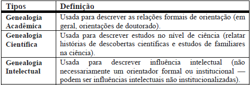 Sugimoto (2014), Mena-Chalco (2016) e Lubek et al. (1995), ao discutirem os estudos de genealogia, fizeram distinção conceitual quanto aos tipos, identificando a existência das genealogias acadêmica, intelectual e científica, conforme se pode observar no Quadro 1.