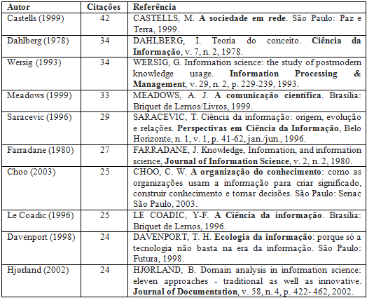 Sob o aspecto temático, entre as dez obras mais citadas constata-se que os assuntos mais representativos são: Fundamentos da CI (quatro), Organização da Informação e do Conhecimento (dois), Gestão da Informação e do Conhecimento (dois), Sociedade da Informação (um) e Comunicação Científica (um).