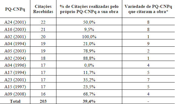 Constatada a existência de um quantitativo representativo de obras dos próprios PQ-CNPq no quadro de textos mais citados, produziu-se a Tabela 1, exibindo o quadro de citações baseado nas 11 obras dos PQ-CNPq que figuram entre as 35 mais citadas do estudo. O conjunto delas recebeu 203 citações. Dessas, 39,4% são citações realizadas pelos próprios PQ-CNPq que escreveram as obras, enquanto que 60,6% foram realizadas pelos pares, o que demonstra um grau razoável de reconhecimento dos PQ-CNPq às obras dos seus congêneres, evidenciando que em certos contextos os próprios PQ-CNPq são influências intelectuais de seus colegas.