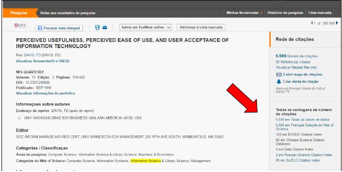 Em relação à indexação, a integração da Rede SciELO à Plataforma WoS oferece a vantagem de aumento da visibilidade da produção indexada. Ou seja, os artigos publicados em qualquer uma das bases integrantes dessa Plataforma têm suas citações contabilizadas em todas as bases que a compõe. A Figura 1 ilustra a questão da citação: observa-se que esse artigo, indexado na WoS, apresenta citações não apenas nessa base, mas também na Biosis CI, Chinese CI, Russian CI e SciELO CI.