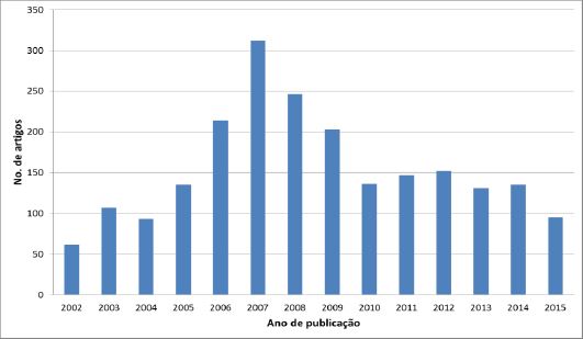 A busca foi realizada em março de 2016, tendo como resultado 2.772 itens cujo assunto é Information Science & Library Science indexados na base, considerando todas as tipologias documentais. Ao se filtrar somente os artigos de periódicos, o universo é de 2.178 referências. Esse conjunto contém artigos de 2002 a 2016, sendo que esse último ano foi eliminado por estar incompleto, resultando em 2.168 referências de artigos de periódicos no período 2002–2015.