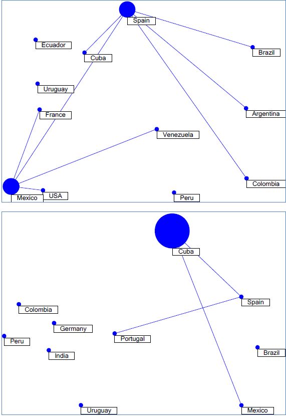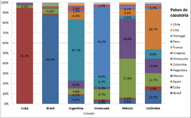 A análise referente ao volume de países de afiliação dos autores em cada coleção apresenta diferentes comportamentos. As coleções de Brasil e Cuba, países de maior número de artigos no tema, são também as que apresentam maior concentração de autores dos seus próprios países. Em outro patamar encontram-se as coleções da Argentina e da Venezuela, que, embora apresentem cerca de 45% de seus artigos com autores locais, já apresentam maior diversidade de países de autoria. A coleção mexicana tem forte concentração em trabalhos publicados por coautores mexicanos e espanhóis, da ordem de 38% cada. Já a coleção colombiana é a que apresenta maior diversidade em termos de presença global, com cerca de 62% de artigos de autores internacionais.