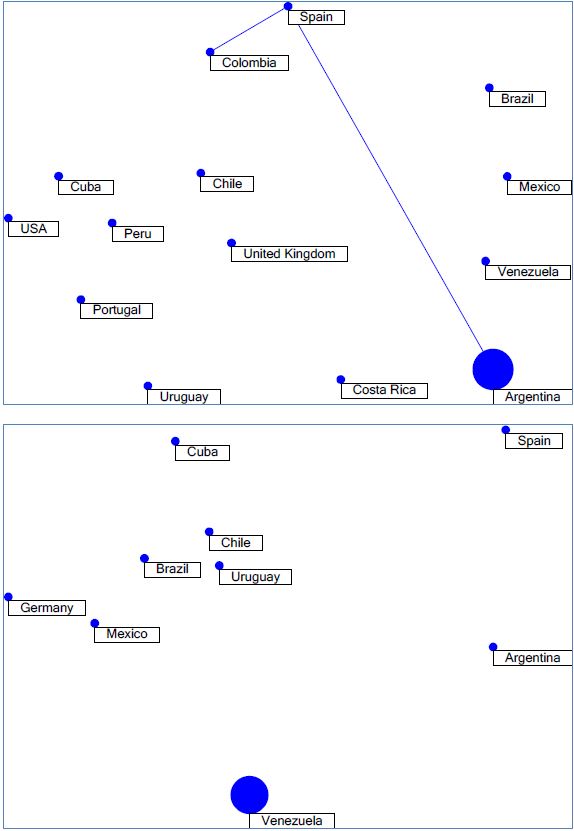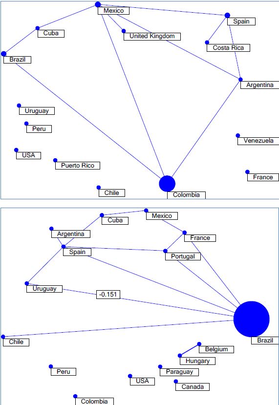 Em relação ao grau de colaboração entre autores de diferentes países, são analisadas as redes de coautoria presentes em cada coleção, mostradas nas Figuras 5a, 5b e 5c. Nas coleções de Colômbia, Brasil e México, observa-se maior número de interações entre autores de diferentes países. As coleções de Cuba e Argentina exibem baixo nível de colaboração, e a da Venezuela, nenhuma interação.