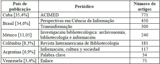 O Quadro 1 apresenta a distribuição, por país de publicação, do número de artigos indexados por revista. Analisando-se os periódicos indexados na base, observa-se nove diferentes títulos, publicados em seis países da América Latina e Caribe. Duas coleções concentram cerca de 70% dos artigos recuperados no tema: o título cubano, com 35,4%, e os dois títulos brasileiros, com 34,6%. Em que pese que os periódicos são indexados em diferentes períodos na base, esse percentual demonstra a representatividade das coleções.