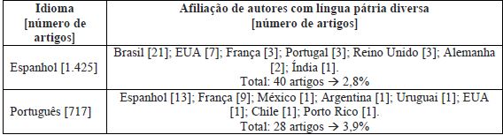 Observou-se baixa presença de autores de países com língua pátria diversa daquela do periódico, conforme ilustrado no Quadro 2. Esse quadro apresenta o idioma de publicação e os países de origem dos autores que não tenham esse idioma como língua mãe: os artigos publicados em espanhol têm cerca de 3% de autores de outro idioma, e os artigos publicados em português se apresentam na mesma faixa, com cerca de 4%. Tais índices mostram baixa internacionalização das revistas da região inseridas na SciELO CI.