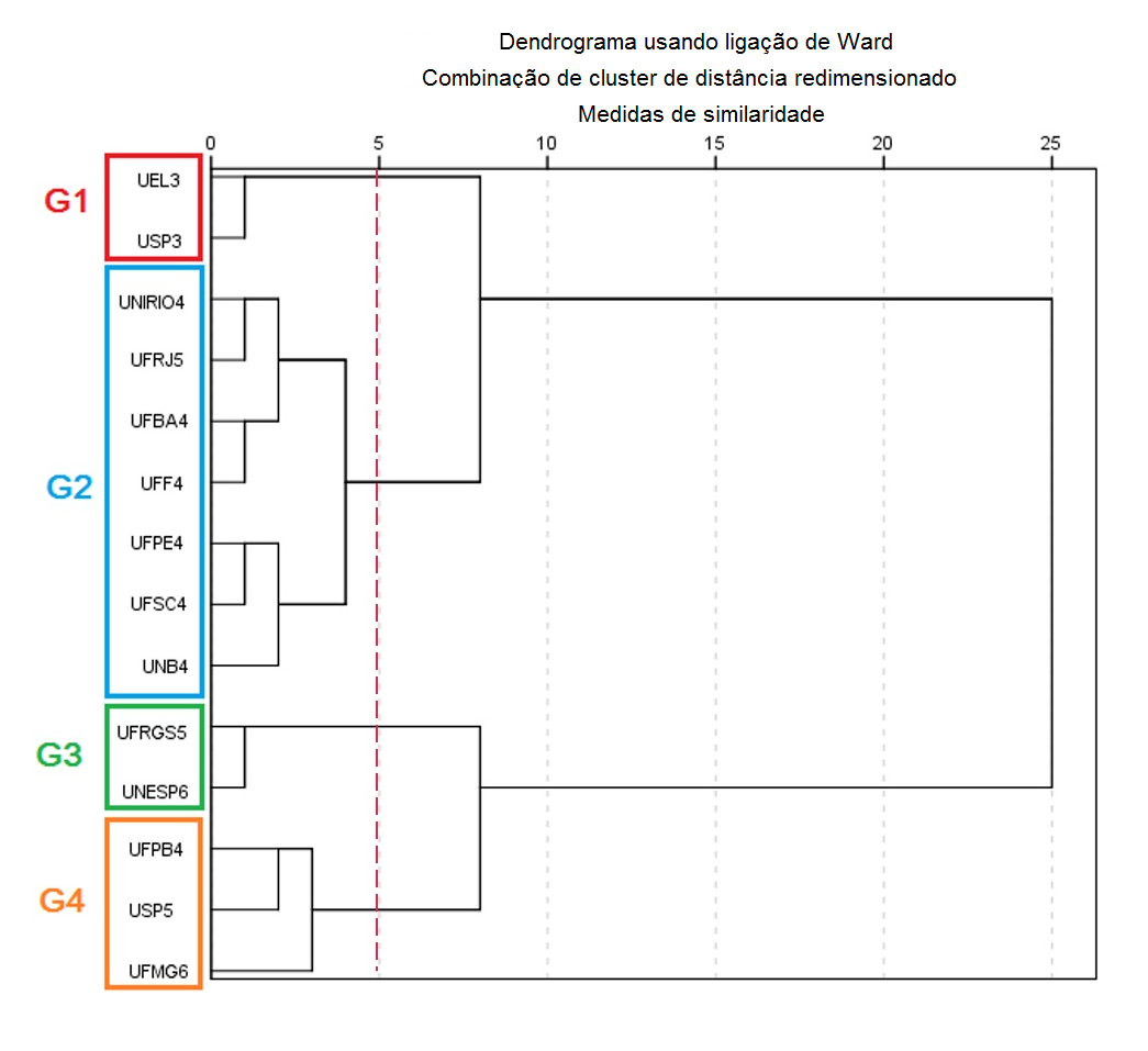 A Figura 1 apresenta o dendrograma que expressa os agrupamentos dos programas de pós-graduação em Ciência da Informação do Brasil em função das suas similaridades relativas aos indicadores presentes na Planilha Comparativa da Avaliação Trienal da área (COORDENAÇÃO..., 2013b), referente ao triênio 2010-2012, em que se observa a constituição de quatro agrupamentos distintos denominados G1, G2, G3 e G4.