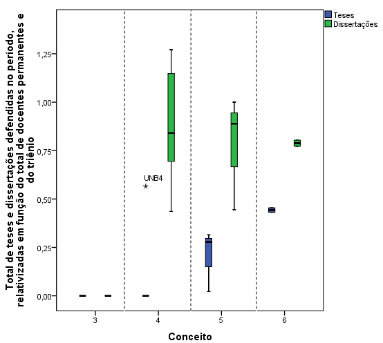 No estrato do conceito 4, destaca-se como outlier superior o programa da UNB, que, apesar de apresentar conceito 4, apresenta um total de teses defendida no período muito maior do que todos os outros programas com mesmo conceito.