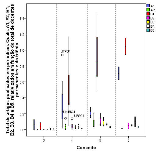 Em relação ao conceito 4, este apresenta um número considerável de publicações em periódicos Qualis A1 e B1, com destaque para os outliers superiores da UFPB. Em relação ao Qualis A2 e B3, destaca-se a UNIRIO como outlier superior.
