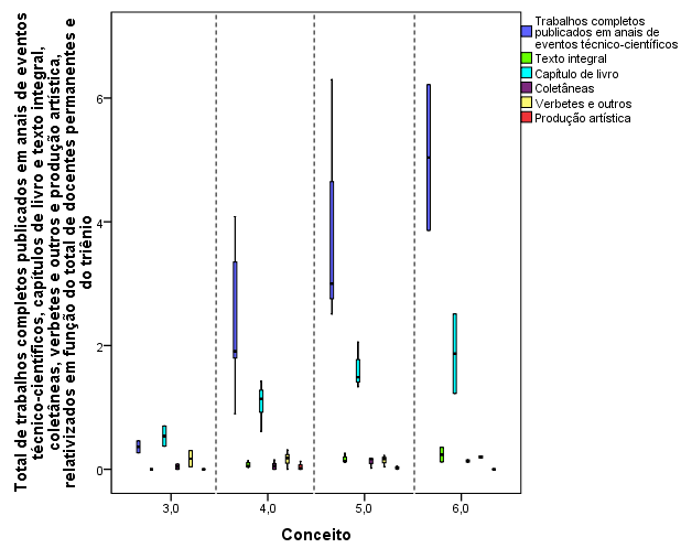 A Figura 4 apresenta o gráfico boxplot referente ao total de trabalhos completos publicados em anais de eventos técnico-científicos, capítulos de livro e texto integral, coletâneas, verbetes e outros e produção artística, por docente, no período, em relação ao conceito dos programas.