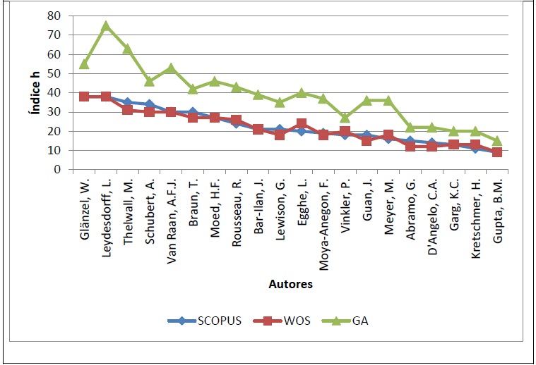 Para a plataforma Google Acadêmico, o autor Leydesdorff tem o maior índice h (h =75) dentre os pesquisadores analisados, seguido por Thelwall (h = 63) e Glänzel (h = 55). Gupta apresenta o menor índice h em todas as bases analisadas.