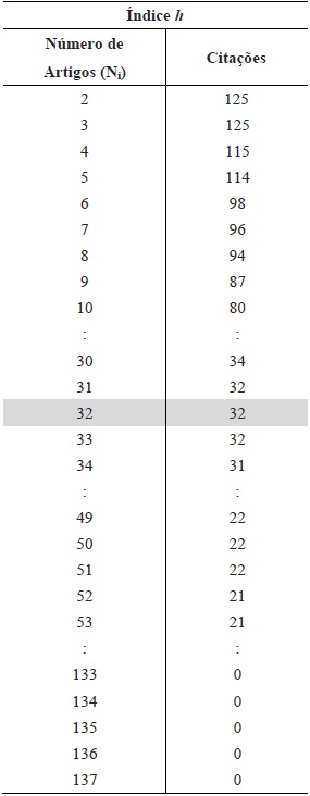 A fim de exemplificar, apresenta-se na Tabela 1 o cálculo do índice h para o pesquisador Thelwall. Para esse pesquisador, recuperaram-se na base Scopus 137 artigos (Np = 137) e as respectivas quantidades de citações recebidas. Para o cálculo do índice h, é necessário colocar em ordem crescente o número de artigos (de 1 a 137) e em ordem decrescente o número de citações e verificar qual é o valor h, tal que h dos Np artigos de Thelwall têm pelo menos de h citações cada e os outros (Np - h) artigos têm não mais que h citações cada. Para esse exemplo, identifica-se que Thelwall tem h = 32, pois existem 32 artigos com pelo menos 32 citações cada e seus outros 105 artigos não têm mais que 32 citações cada.