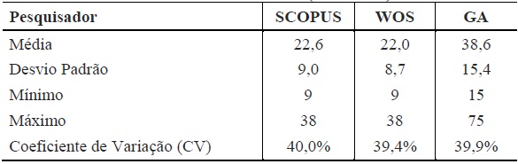 A média do índice h para os investigadores dessa temática para as diferentes bases foram: índice-hwos = 22,0, índice-hscopus = 22,6 e índice-hGA = 38,6. Verifica-se uma pequena diferença entre os valores médios encontrados para Scopus e WoS, no entanto, a estimativa para a média do índice h para o Google Acadêmico é superior às demais.