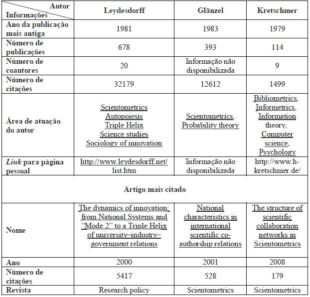 Devido a tais diferenças, buscou-se analisar o comportamento de alguns autores, em especial, no Google Acadêmico. Para isso, analisaram-se os perfis dos pesquisadores Leydesdorff, Glänzel e Kretschmer. O primeiro foi escolhido devido ao fato de ter sido o pesquisador com maior índice h no GA; Glänzel obteve o maior índice h na Scopus e WoS; e Kretschmer obteve índices h semelhantes nas três plataformas analisadas.