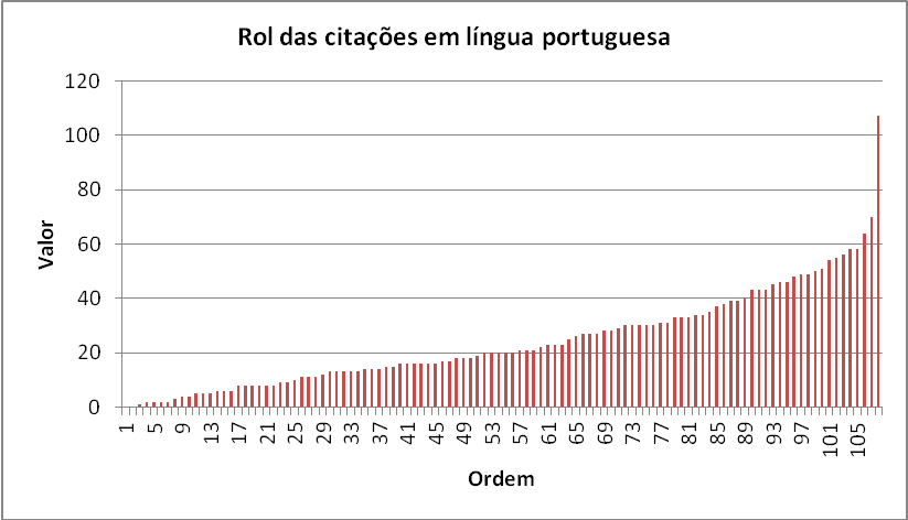 Pela formulação de Tukey (1977), fórmulas (1) e (2), achamos: O.I. < – 25 referências (não há outliers inferiores) e O.S. > 63 referências. Portanto, detecta-se a presença de três outliers (valores 64, 70 e 74 referências). Nossos resultados estão em concordância qualitativa com os achados de Santos (2010, p. 138), que também detectou mais de um outlier. É importante rememorar que possíveis divergências de cálculo ocorram devido ao cálculo dos quartis, que variam de acordo com o software estatístico utilizado.