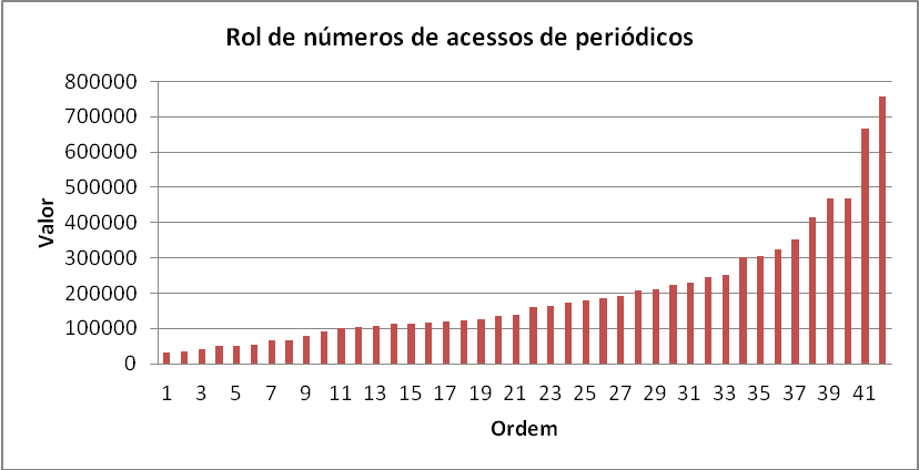Já a dissertação de Santos (2010) estudou 70 periódicos científicos nas áreas de Ciências Sociais e Humanidades indexados na base SciELO Brasil. Uma análise preliminar usando estatística multivariada detectou três grupos de periódicos com características similares. A nossa análise será limitada ao grupo um, que englobou 42 periódicos, e também limitada aos seguintes dados univariados: citações recebidas, fator de impacto e número de acessos.