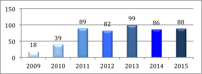 A partir do levantamento do termo “Repositório Institucional” no Twitter, no período 2009–2015, foram recuperadas 501 postagens (tweets), distribuídas por ano conforme o Gráfico 1.