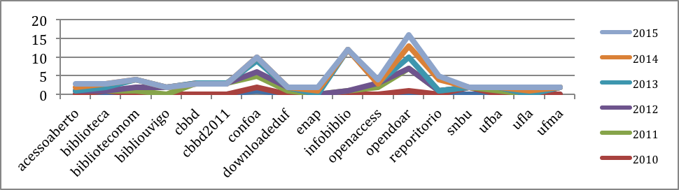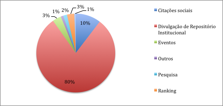 Esses números são bastante expressivos diante do cenário mundial de desenvolvimento de Repositórios Digitais. A expansão de repositórios institucionais e a difusão de informações científicas convergem com o fenômeno da utilização e disseminação de informações em mídias sociais e, nesse sentido, se configuram como um locus de análise entre mídia social, atores e comunicação científica.