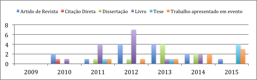 As postagens referentes às citações sociais foram agrupadas em seis tipos, entre os quais “Livro” foi mencionado 15 vezes, seguido de “Artigo de revista”, “Trabalho apresentado em evento”, “Dissertação”, “Tese” e “Citação direta” com 14, 8, 8, 6 e 1 instâncias respectivamente.