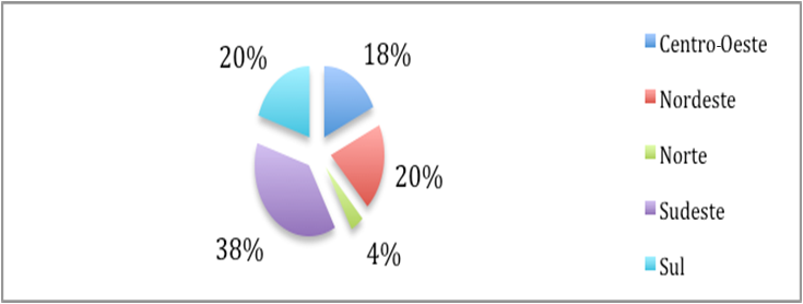 Ressalta-se que a “Citação direta” é caracterizada como a descrição baseada nas estruturas habituais definidas pelos órgãos de normalização, como, por exemplo, a NBR 10520 da ABNT para a realidade brasileira. Enfatiza-se também que o ano de 2012 mostrou o maior número de citações sociais, seguido de 2013, evidenciando o Repositório da UFBA, que disponibilizou o maior número de livros publicados pela Editora da Instituição. Em relação às instituições mencionadas, foi efetuado um levantamento regional, como mostra o Gráfico 4.