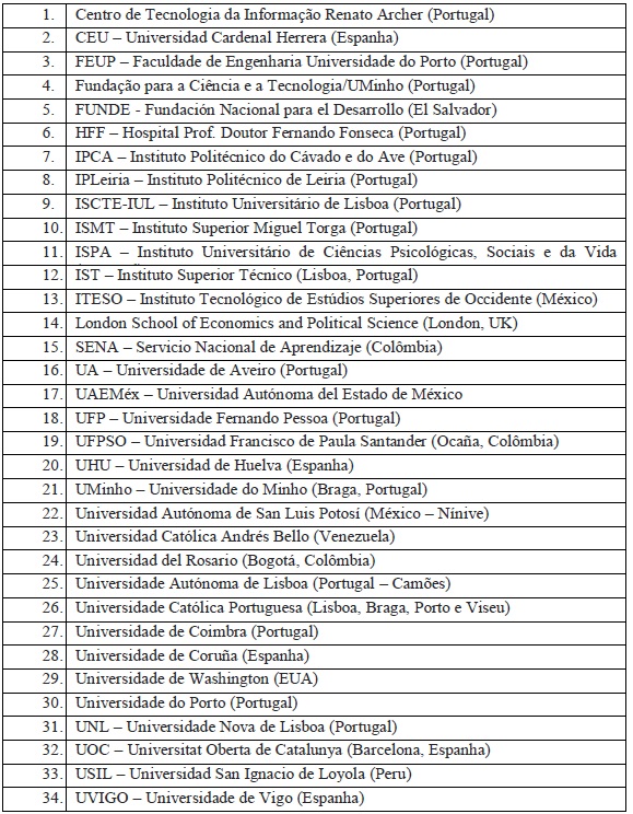 Embora a pesquisa do termo Repositório Institucional tenha sido realizada para recuperação em língua portuguesa, o que revelou que foram mencionadas 50 instituições brasileiras, foram mencionadas também 34 instituições que possuem repositórios institucionais localizadas fora do Brasil, sobretudo em Portugal, além de Colômbia, El Salvador, Espanha, Estados Unidos, Inglaterra, México, Peru e Venezuela. No quadro abaixo podem ser visualizadas as Instituições estrangeiras mencionadas pelo termo buscado no Twitter no período analisado.