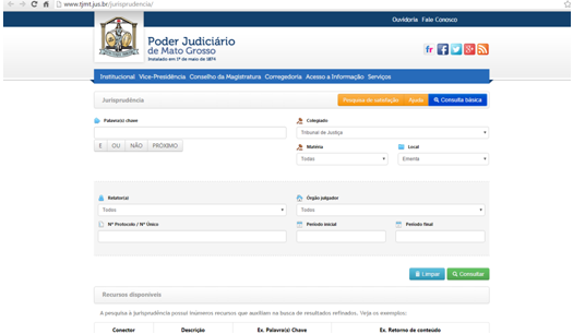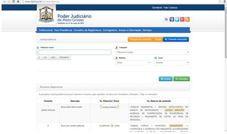 [...] Na parte da busca por acórdãos e ementas, as melhorias foram feitas para aprimorar a pesquisa por meio de conectores, consulta refinada e consulta avançada. Nestas últimas opções, o internauta poderá selecionar o órgão julgador, o magistrado autor da decisão e, ainda, especificar o período inicial e final da busca (MATO GROSSO, 2014).