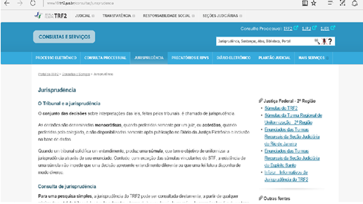 O Portal de Jurisprudência do TRF 2 está dividido em 2 partes. A 1ª parte trata de assuntos diversos, como uniformização, súmulas, divulgação e outros tópicos relativos à área de jurisprudência. A 2ª parte é destinada a pesquisas específicas no TRF 2, pesquisas simultâneas nos Tribunais Federais (STF, STJ, TRFs etc.) e pesquisas referentes à Turma Regional de Uniformização e às Turmas Recursais dos Juizados Especiais Federais da 2ª Região (BRASIL, 2016b).