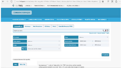Já o mecanismo de busca de jurisprudência implantado no Portal do Tribunal Regional Federal da 2ª Região (TRF2), região do Rio de Janeiro e Espírito Santo, permite a recuperação simultânea em seus vários tipos de base: ementas, inteiro teor, decisões monocráticas, súmulas, acórdãos históricos e outras publicações.