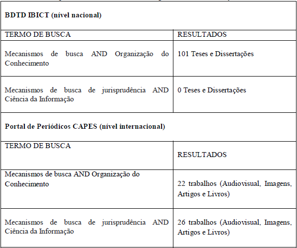 Em consonância, o primeiro objetivo específico é demonstrar se a Ciência da Informação, especialmente a área de Organização do Conhecimento, tem estudado sobre os mecanismos de busca de jurisprudência. Para isso, foi feito um levantamento bibliográfico em duas bases de dados: a do Portal de Periódicos da Coordenação de Aperfeiçoamento de Pessoal de Nível Superior (CAPES) e a da Biblioteca Digital de Teses e Dissertações, do Instituto Brasileiro de Informação em Ciência e Tecnologia (BDTD/IBICT), em âmbito internacional e nacional respectivamente.