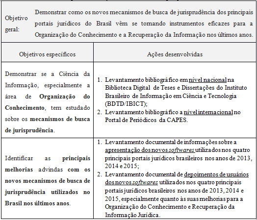 O objetivo geral desta pesquisa é demonstrar como os novos mecanismos de busca de jurisprudência dos principais portais jurídicos do Brasil vêm se tornando instrumentos eficazes para a Organização do Conhecimento e a Recuperação da Informação nos últimos anos.