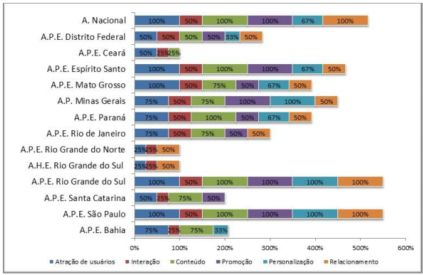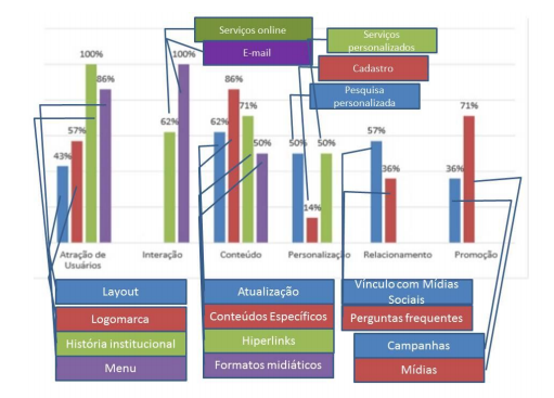 No que tange a relacionamentos nos websites, verificou-se as presenças de mídias sociais e alguns referenciais de auxílio para navegação na plataforma advento de ferramentas tecnológicas, o que, neste caso, possibilita que o indivíduo seja um ativo social, registrando comentários, compartilhando informações e transformando-se em protagonistas na Web 2.0. O Gráfico 1 representa todos os indicadores analisados nos websites, levando-se em consideração cada subcategoria existente (ver Figura 2).
